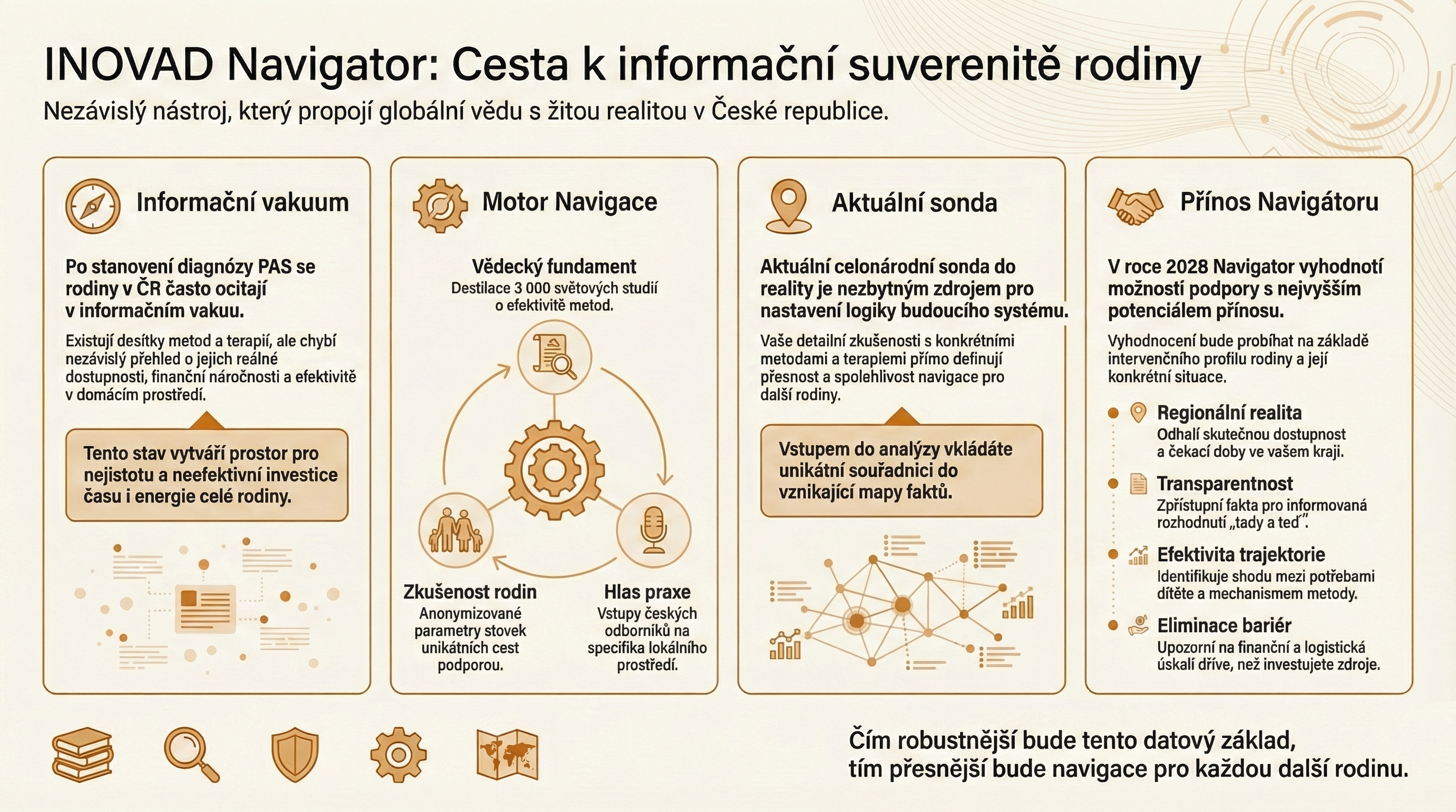 Mým prvořadým cílem je zajistit, aby finanční situace rodiny nikdy nebyla překážkou v přístupu k důležitým informacím. Projekt INOVAD vnímám jako digitální infrastrukturu, která má posílit informační suverenitu rodičů. Proto bude základní pilíř celého systému – tedy interaktivní navigace v datech a přehled efektivity intervencí – pro rodiny dětí s PAS dostupný zdarma.